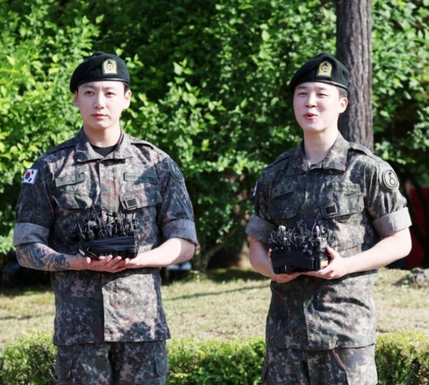 육군 5사단 포병여단에서 복무를 마친 BTS 정국, 지민이 11일 오전 경기 연천군 연천공설운동장에서 전역 소감을 전하고 있다./2025.06.11 /사진=김휘선