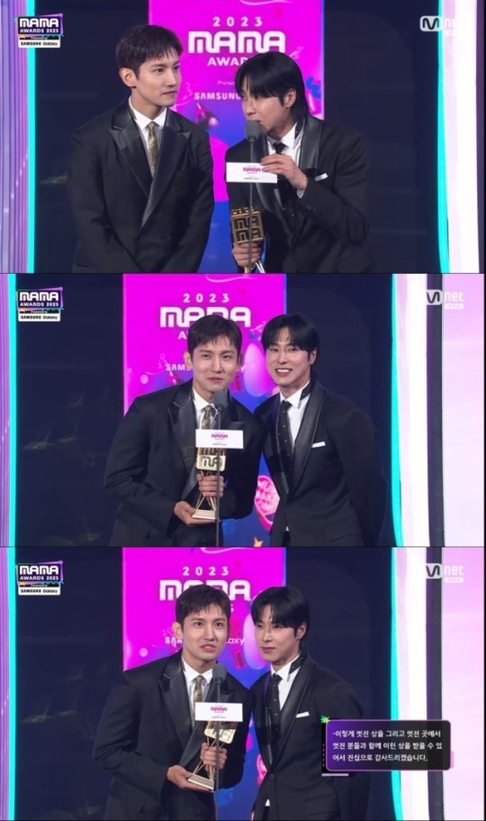 리더 유노윤호는 "오랜만에 우리가 '마마 어워즈'에 나온 만큼 뜻깊은 상 주셔서 너무 감사드린다. 사실 이 상은 우리를 응원해 주시는 카시오페아(팬덤명) 여러분과 비기스트(일본 팬덤명) 여러분이 같이 이뤄낸 상이라고 생각이 든다"라고 감사 인사를 전했다.