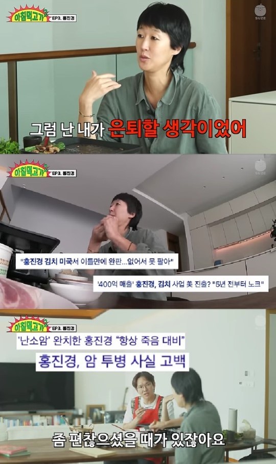 홍진경은 난소암 투병 당시를 언급하며 "집에서 그 전화를 받았는데 내가 일찍 어떻게 되는 건 어쩔 수 없는데 아이가 너무 불쌍하더라"라며 "항암을 6번 했는데 그때 약 냄새가 지금도 차병원 앞에 가면 난다. 난소암 1기에서 발견돼서 운이 좋았다. 의사가 조직을 한번 떼 보고 싶었다고 하더라. 내 은인인 거다. 지금은 많이 좋아졌다"고 전했다.