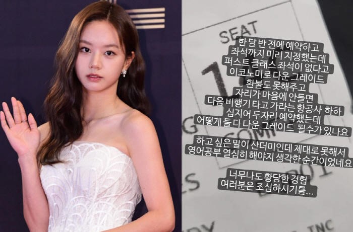 31일 혜리는 자신의 SNS를 통해 "한 달 반 전에 예약하고 좌석까지 미리 지정했는데 퍼스트 클래스 좌석이 없다고 이코노미로 다운 그레이드"라면서 티켓 사진과 함께 상황을 설명했다.