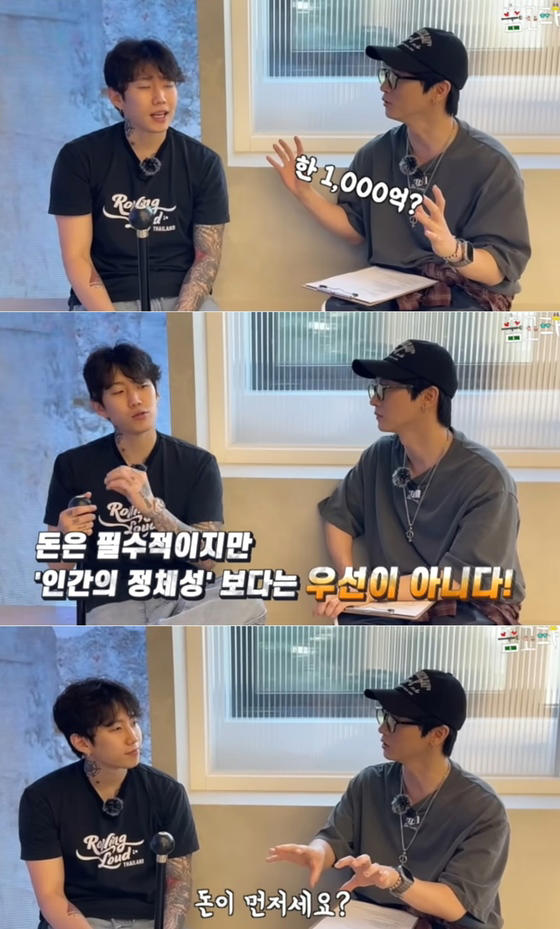 이어 박재범은 돈에 대한 신념을 밝혔다. 그는 "AOMG 등 여러 소속사를 만들고 관리하면서 돈은 많이 벌었을 것 같다"는 장우혁의 물음에 "사람들이 생각하는 만큼은 아닐 것"이라면서 "1000억 정도? 사실 정확한 액수 같은 건 모르겠다. 확인한 적도 별로 없다"고 알렸다.