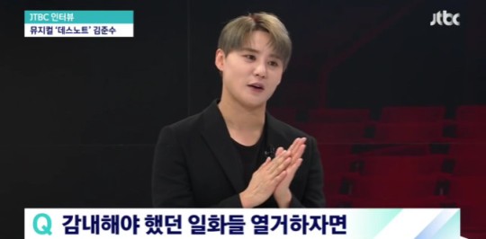 28일 방송된 JTBC '뉴스룸'에는 뮤지컬 '데스노트'에서 엘(L) 역으로 열연 중인 김준수가 출연해 다양한 이야기를 나눴다.