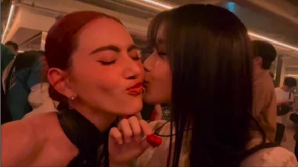 배우 아이유가 태국 배우 다비카 후네와 뽀뽀하는 장면이 포착됐다.