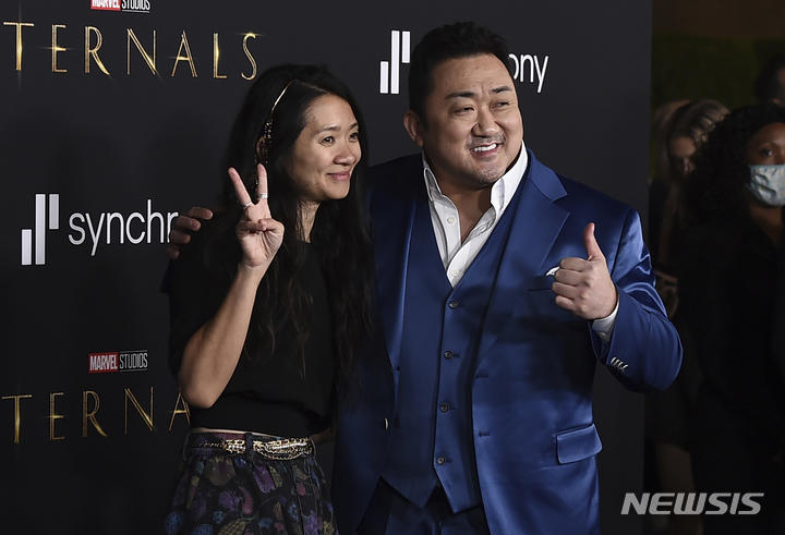 [로스앤젤레스=AP/뉴시스] 배우 마동석(오른쪽)이 18일(현지시간) 미 캘리포니아주 로스앤젤레스에서 열린 영화 '이터널스' 시사회에 도착해 클로이 자오 감독과 포토타임을 갖고 있다. 마동석의 미국 본명은 '돈 리'(Don Lee)로 이번 영화에서 주인공인 길가메시 역을 맡았다. 2021.10.19. © 뉴시스