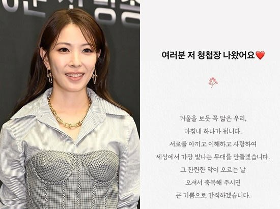 공개된 사진에는 '거울을 보듯 꼭 닮은 우리, 마침내 하나가 됩니다. 서로를 아끼고 이해하고 사랑하여 세상에서 가장 빛나는 무대를 만들겠습니다. 그 찬란한 막이 오르는 날 오셔서 축복해주시면 큰 기쁨으로 간직하겠습니다'라는 글이 적혀있었다.