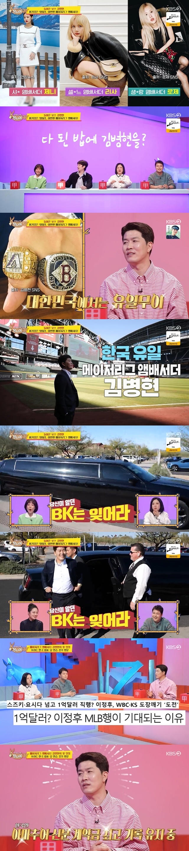 이날 김병현은 앰버서더로서 블랙핑크 로제, 리사, 제니 등과 이름을 나란히 했다. 이에 MC들이 "왜?"라며 의아해하는 가운데 연예계 소문난 야구팬 신소율은 "반지가 2개라서?"라고 홀로 짐작했다.