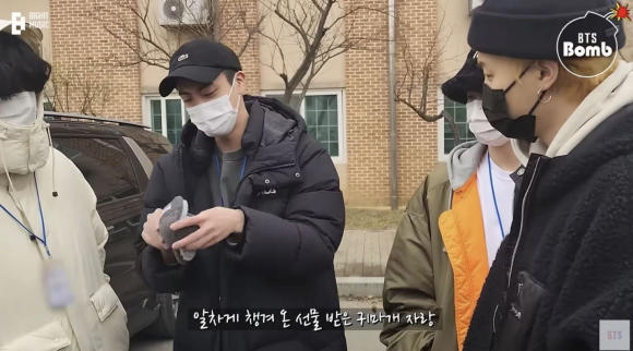 진은 조용히 자신이 가져온 가방에 손을 넣더니 무언가를 찾았다. 제이홉은 “뭐 챙겨 왔어요?”라고 물었고, 진은 “군인 필수품”이라며 귀마개를 꺼냈다. 이내 익숙한 듯 귀에 착용하더니 “아 따끈따끈하다”라고 말해 미소를 자아냈다.
