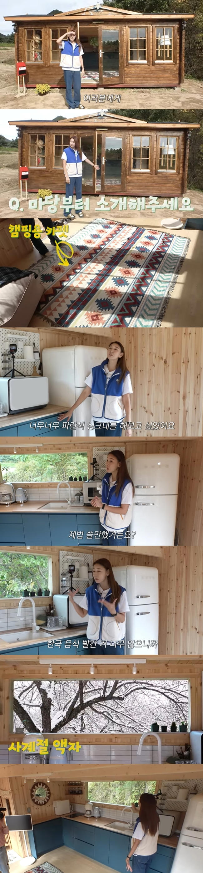 한혜진은 집에 있던 쇼파와 캠핑용 카펫 소품으로 아기자기한 분위기를 완성했다. 이어 "기안이 왔을 때 아무것도 없었는데 그 이후에 싱크대를 주문 제작했다. 파란색으로 너무 하고 싶었다. 농막에 해보고 싶은 걸 다 해보고 싶어서 제가 직접 골랐다. 뉴욕 아파트에 살 땐 상판이 나무였는데 살만했다. 한국에선 그런 식으로 주문하려고 하면 다들 걱정하더라. 그래서 농막이 썩든 하고 싶은 거 다 할 거라고 했다"고 비하인드를 전했다.