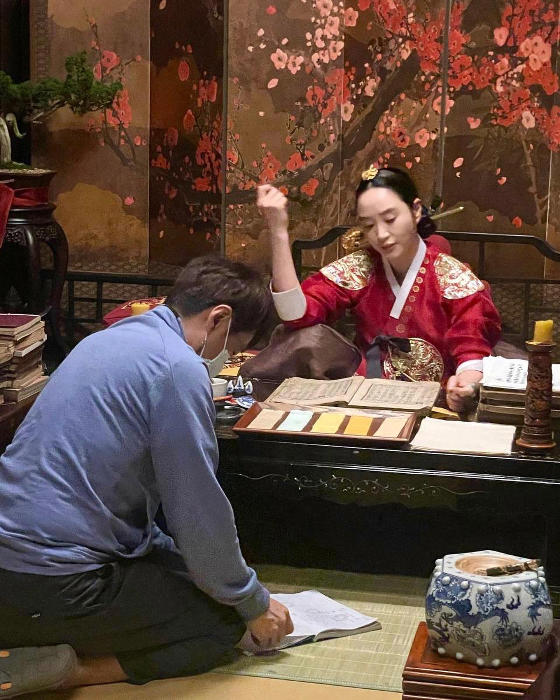 김혜수가 화려하게 수가 놓아진 한복을 입고 있어, 드라마 '슈룹' 촬영임을 예상케 하고 있다.
