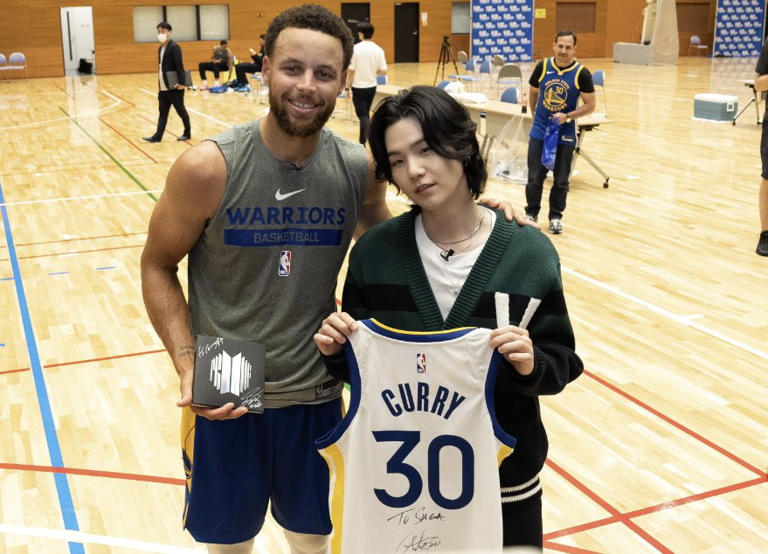 커리는 사인 유니폼을 건넸고 슈가도 BTS 사인 앨범을 선물했다. 두 사람은 함께 사진 촬영도 했다. 커리는 웃으며 슈가와 팀 동료의 댄스 배틀을 제안하기도 했다. 커리는 NBA 통산 최다 3점슛 기록을 보유자로 NBA 파이널 우승을 4차례 이끈 수퍼 스타다.