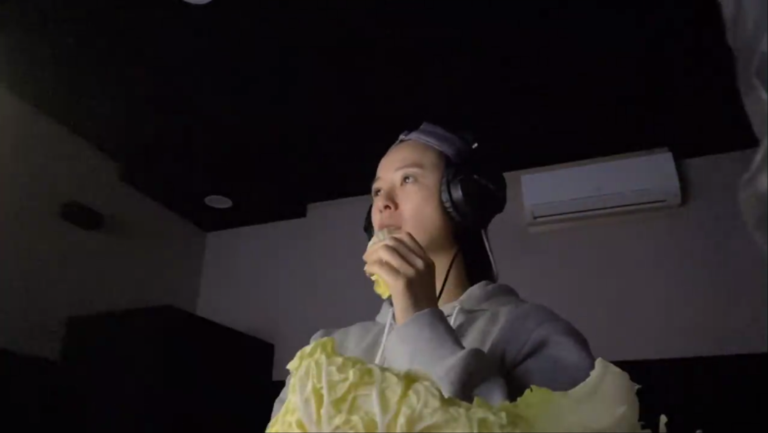 영상 속에는 어두운 방 안에서 헤드셋을 끼고 영상을 시청하는 정유미의 모습이 담겼다. 그의 앞에 위치한 양배추가 눈길을 끈다. 정유미는 한 손에 양배추를 들고 조금씩 뜯어먹고 있다. 양배추가 줄지 않는다고 느낄 정도로 적은 양을 섭취하고 있다.