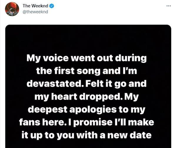위켄드는 공연 후 자신의 트위터에 "첫 노래를 부르는 동안 쉰 목소리가 나와서 망연자실했다. 목소리가 쉰 것을 느꼈고 심장이 떨어지는 것 같았다"고 밝혔다.