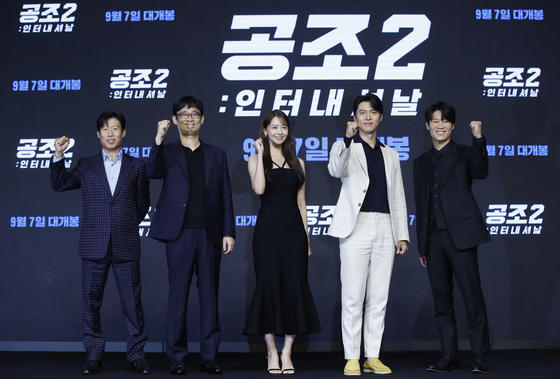 배우 유해진(왼쪽부터)과 이석훈 감독, 배우 임윤아(소녀시대 윤아), 현빈, 진선규가 16일 오전 서울 영등포구 여의도 콘래드 호텔에서 진행된 영화 '공조2: 인터내셔날' 제작보고회에서 포즈를 취하고 있다.