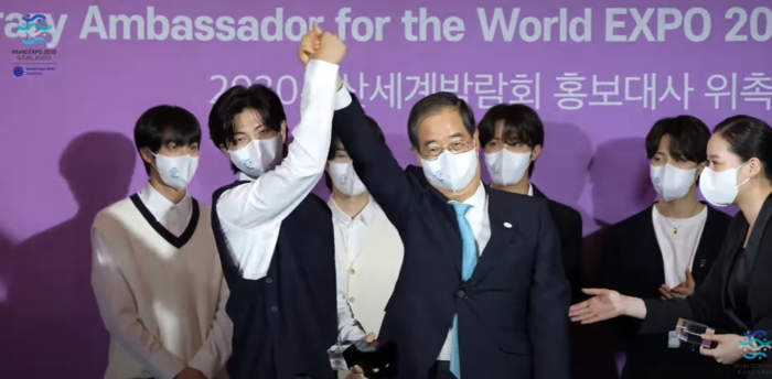 부산시와 2030 부산세계박람회 유치위원회는 지난 19일 서울 용산구 하이브 사옥에서 2030 부산세계박람회 홍보대사 위촉식을 열었다. 이날 행사에는 BTS 멤버 7인을 비롯해 유치위원회 공동위원장인 한덕수 국무총리와 최태원 대한상공회의소 회장, 박형준 부산시장, 박지원 하이브 대표이사, 장성민 대통령실 정책조정기획관 등이 참석했다.