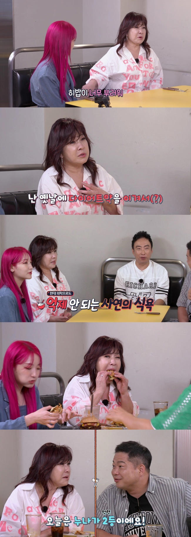 현주엽은 노사연에게 "입맛이 더 당기더냐"며 당시 상황을 궁금해한다. 그러자 노사연은 "병원에서 음식을 더 먹더라. 약을 이겼다"며 다이어트약도 제어할 수 없었던 식욕을 고백해 멤버들을 웃음 짓게 한다.