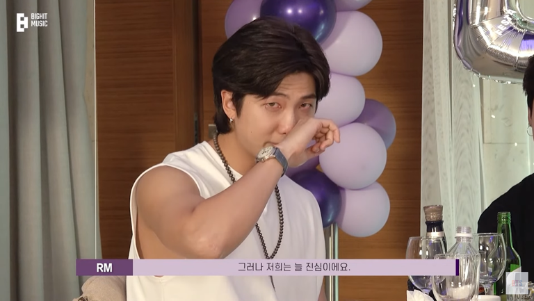 방탄소년단(BTS) 리더 RM이 14일 공개된 영상에서 그룹 활동 잠정 중단 발표를 하며 터져나온 눈물을 닦고 있다. 방탄소년단(BTS) 공식 유튜브 ‘BANGTANTV’ 캡처