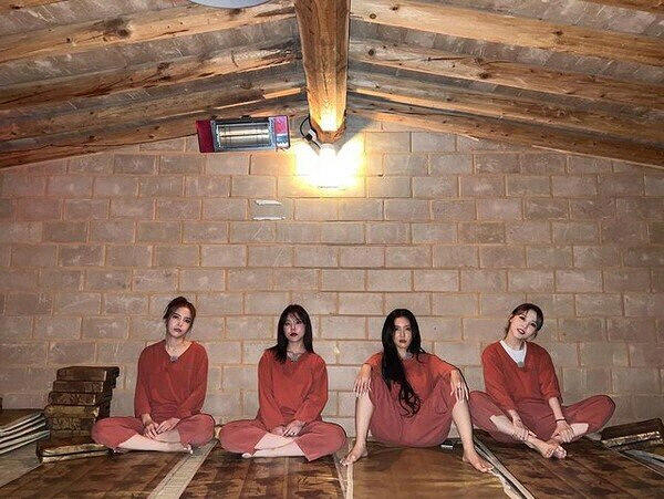 사진 속 마마무 멤버 문별, 솔라 휘인, 화사는 황토색 찜질복을 입고 찜질방에 모여있다. 화보 못지 않은 과감한 포즈가 눈길을 끈다.
