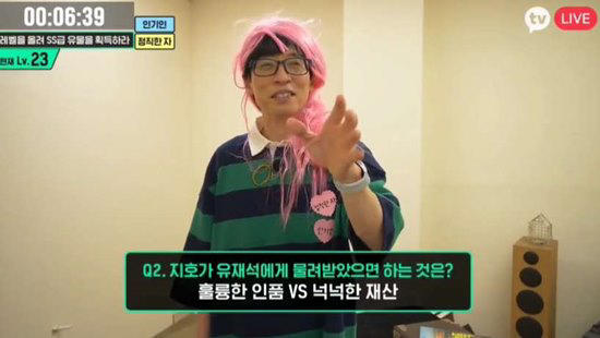 선택지는 '훌륭한 인품'과 '넉넉한 재산'이었다. 채팅창을 보지 않기 위해 눈을 가린 유재석은 "우리가 서로 통해야 한다"며 "읽었다. 나는 퍼센티지까지 보인다. 80%가 인품을 선택했을 것"이라고 예상했다.