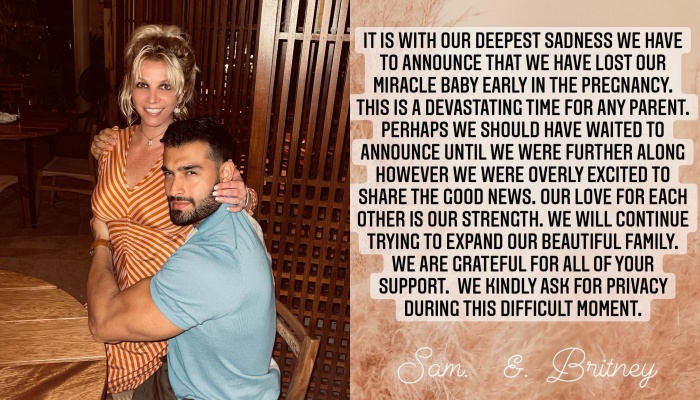 스피어스는 이날 인스타그램에 글을 올려 "임신 초기에 우리의 '기적의 아이'를 잃었다는 것을 발표해야만 해 매우 슬프다"고 밝혔다고 폭스 뉴스와 연예매체 TMZ가 보도했다.