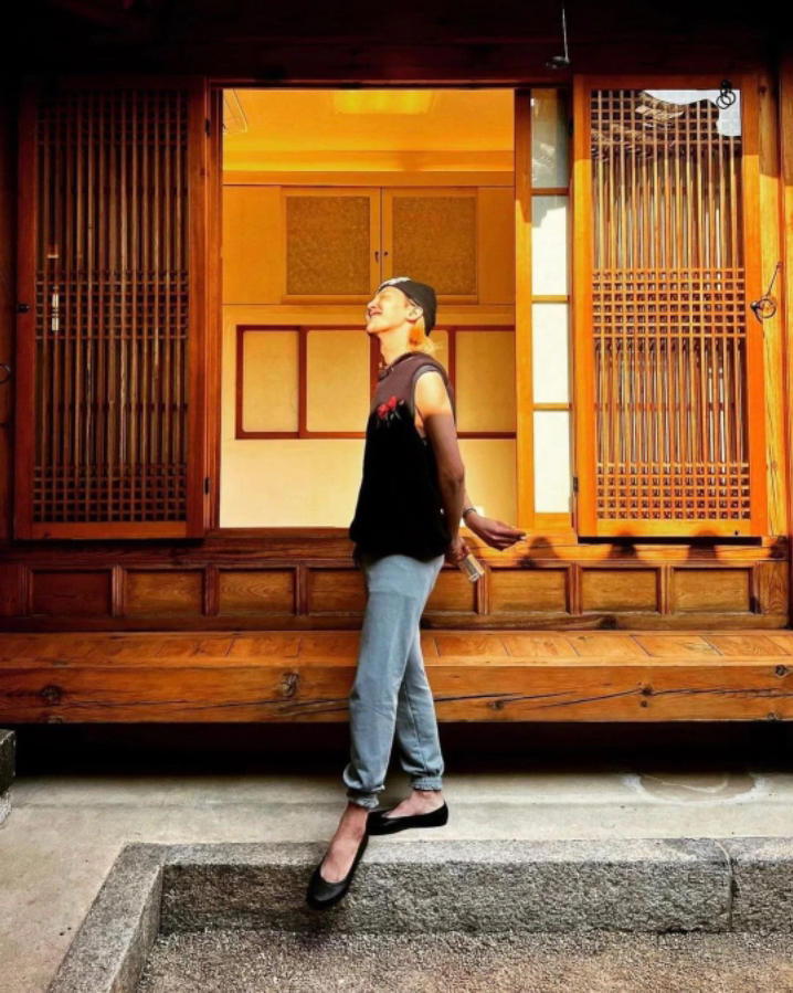 공개된 사진 속 지드래곤은 한옥을 찾아 포즈를 취한 모습이다. 검정 고무신을 신고 민소매 셔츠와 조거 팬츠 차림으로 환하게 미소짓는 그의 모습에서 여유로움이 느껴진다.