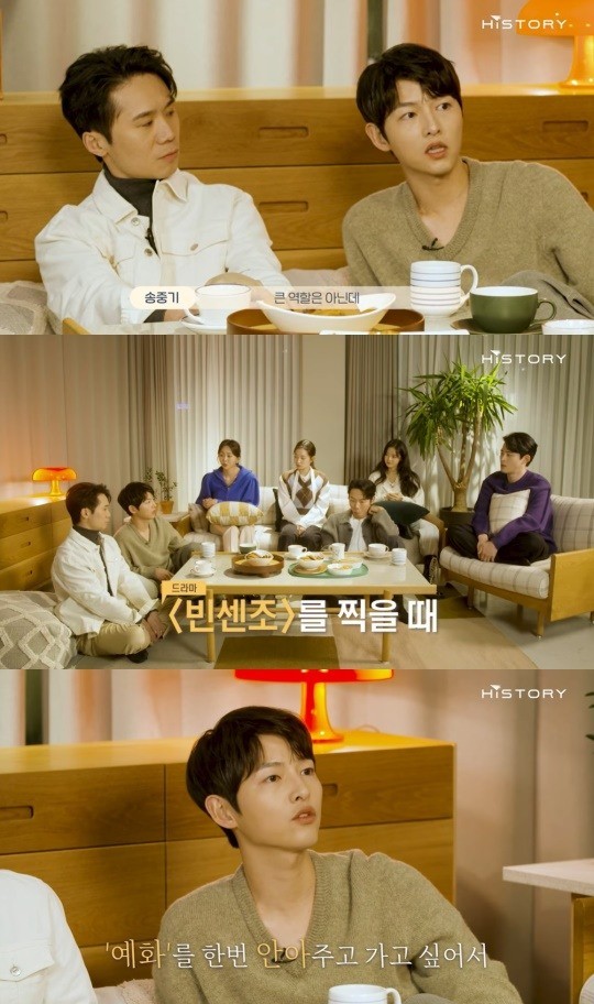 송중기는 "최근엔 '빈센조'를 찍을 때였다"고 자신의 이야기를 전하며 "극중 엄마가 돌아가시고 다음날 출근하는 계단에서 상가 사람들이 나를 맞이해주는 장면이었다. 배우들이 똑같은 마음으로 찍었는데 (서)예화가 그날 한 대사가 아직도 기억난다. '나 임신을 해서 몸 속에 아기가 있는데 그래도 싸울 수 있으니 도움이 필요하면 얘기해주세요' 했다. 임산부가 그 대사를 하니까 세게 오더라"고 말했다.