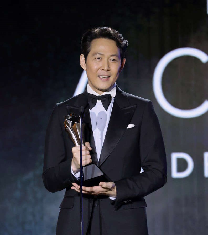 13일(현지시각) 미국 로스앤젤레스(LA)에서 열린 제27회 미국 크리틱스초이스 시상식에서 이정재는 남우주연상 트로피를 들어 올렸다.