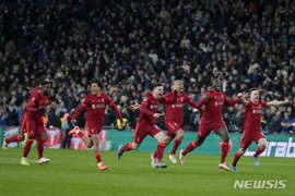© 뉴시스 [런던=AP/뉴시스] 리버풀 선수들이 28일(한국시간) 열린 첼시와 2021~22 카라바오컵(리그컵) 결승전에서 상대 골키퍼의 실축으로 우승을 확정지은 뒤 환호하고 있다. 2022.02.28. / 박상현