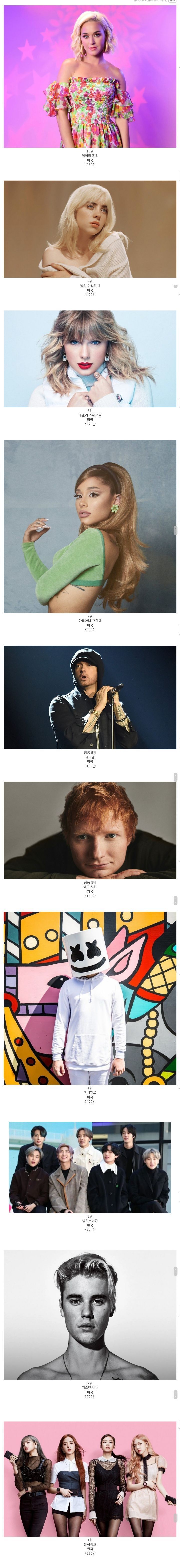 전세계 가수 유튜브 구독자 순위 TOP 10