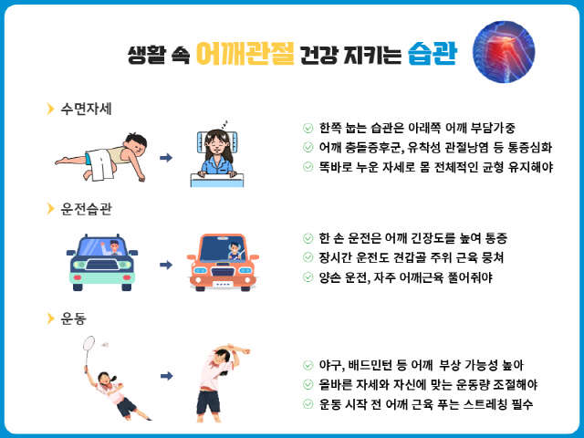 인천힘찬종합병원 정형외과 김형건 진료원장은 "수영, 야구, 골프, 배드민턴 등 반복적인 동작으로 어깨를 많이 사용하는 운동은 어깨 관절 부상을 유발할 가능성이 높다"며 "잘못된 동작을 지나치게 반복하면 과사용으로 인해 어깨에 무리가 될 수 있고, 아령이나 덤벨을 들고 팔을 옆으로 벌리는 운동이 어깨에 가장 무리가 되기 때문에 주의해야 한다"고 말했다.