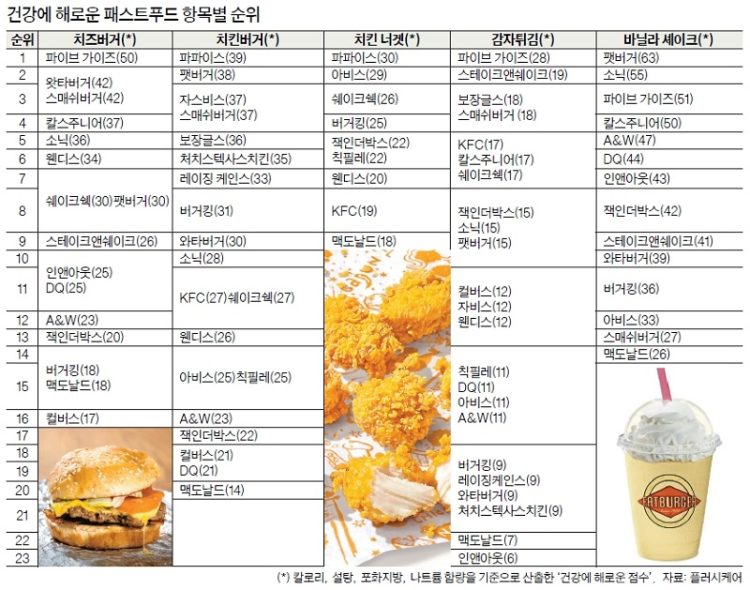 플러시케어는 이번 조사에서 전국의 24개 유명 패스트푸드 체인의 치즈버거, 치킨버거, 치킨너겟, 감자튀김, 바닐라 셰이크 등 5가지 대표 메뉴를 대상으로 칼로리, 설탕, 포화지방, 나트륨 함량 등을 조사해 건강유해점수를 집계했다.