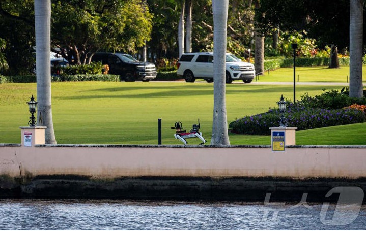로이터 통신이 지난 8일(현지시간) 공개한 영상에는 로봇개가 미 비밀경호국 요원과 함께 트럼프의 플로리다주 팜비치 마러라고 자택 주변을 순찰하는 장면이 담겼다. 로봇개 몸에는 "쓰다듬지 마세요"란 경고문이 적혀 있었다.