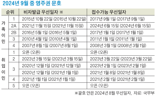 가족이민 1순위(시민권자 성년 미혼자녀) 발급일자는 2015년 10월 22일, 접수가능우선일자는 2017년 9월 1일이다. 가족이민 2A순위(영주권자 직계가족)의 경우 발급일자는 2021년 11월 15일, 접수가능일자는 2024년 6월 15일이었다.