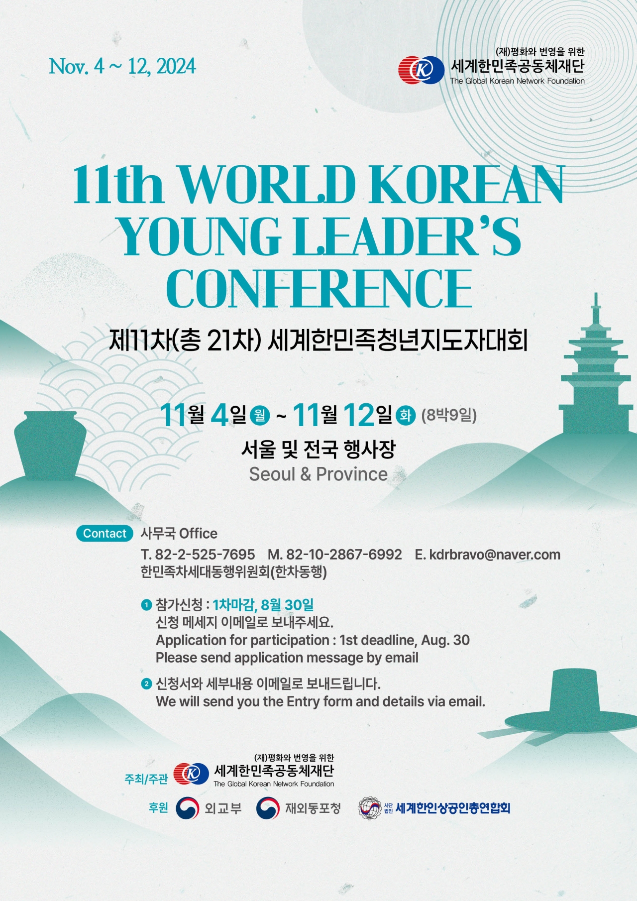 세계한민족공동체재단(총재 김덕룡)은 오는 11월 4∼12일 서울 등 전국에서 열리는 '제11차 세계한민족청년지도자대회'에 참가할 재외동포 청년들을 모집한다고 16일 밝혔다.