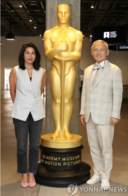 유인촌 문화체육관광부 장관이 지난 28일(현지시간) 미국 로스앤젤레스 아카데미영화박물관을 방문해 에이미 호마 아카데미영화박물관 디렉터 겸 대표이사와 기념 촬영하고 있다.