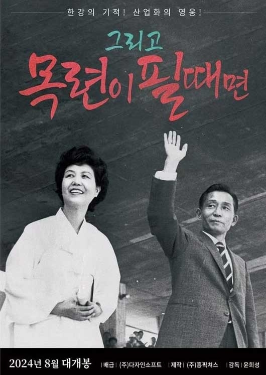 가수 김흥국이 설립한 영화사 흥.픽쳐스가 이날 공개한 ‘그리고 목련이 필 때면’의 공식 포스터에는 박 전 대통령이 대통령 취임 이후 육 여사와 함께 국민에게 손을 흔드는 모습이 담겼다.