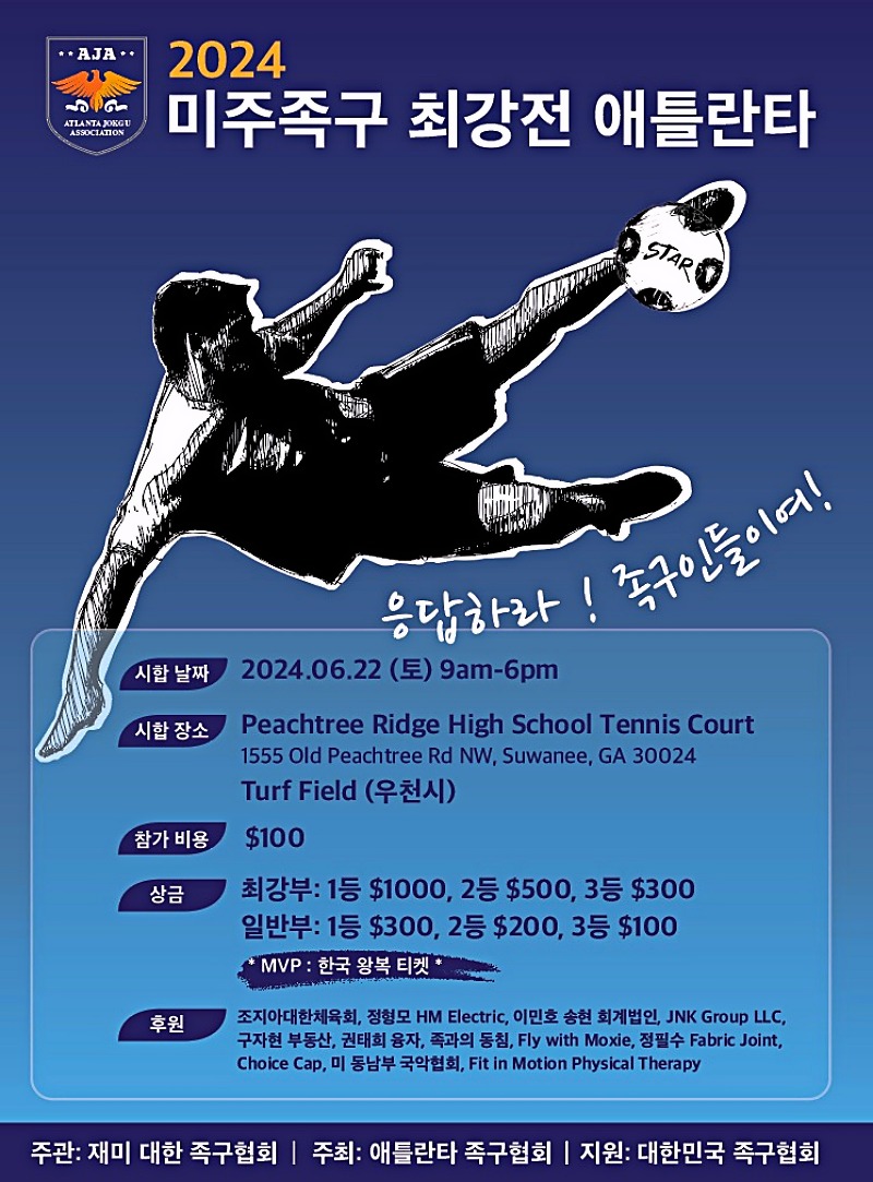 2024 미국 전역 족구팀 최강전 개최 최고관리자 0 293 2024.06.09 04:55 <출처©중앙일보> 족구 최강전미국 전역의 족구팀들이 모이는 ‘2024 미주 족구 최강전 애틀랜타’가 22일 토요일 오전 9시부터 오후 6시까지 스와니 피치트리릿지고교(1555 Old Peachtree Rd NW) 테니스코트에서 열린다. 참가비는 100달러이며, 최강부와 일반부로 나뉘어 경기한다. 최강부 1등 상금은 1000달러, 일반부는 300달러다. 또 MVP에게는 한국 왕복 티켓이 주어진다. 문의=678-207-9819 (구자현 재미대한 족구협회장)