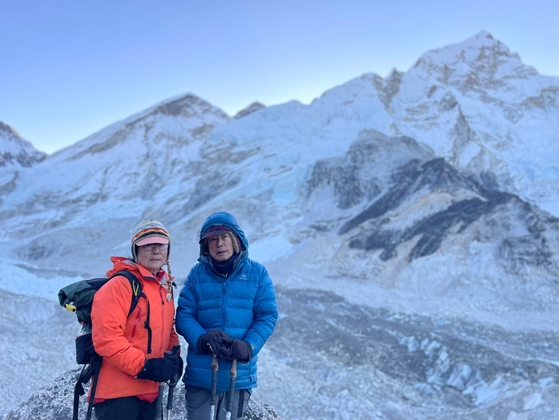 에베레스트 베이스 캠프를 등반하고 있는 70대 한인부부 아내 올리비아 이(70)씨와 남편 이준해(74)씨. [본인제공]