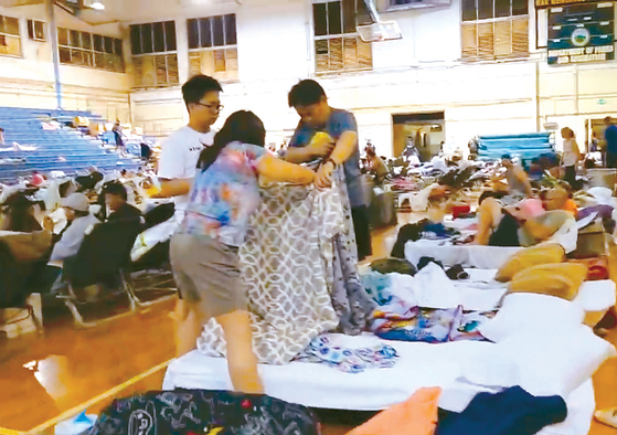 이곳에는 약 500명이 머물고 있다. 대피소에서 한인 가족이 침구를 정리하고 있다. [최영화 사장 제공]