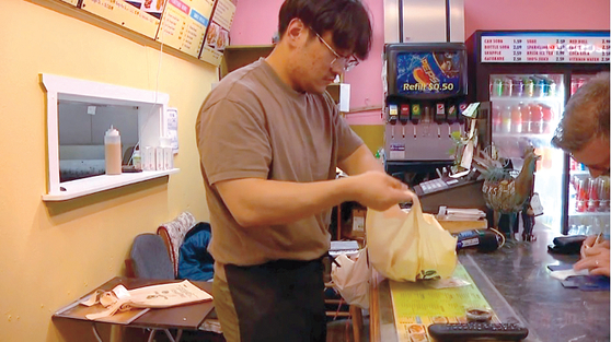 최근 다시 문을 연 식당에서 아들 김주영씨가 손님이 주문한 투고 음식을 건네주고 있다. [K5 캡처]