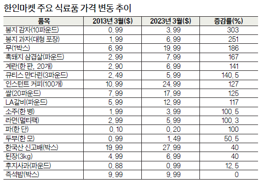 10년새 한인마켓 식료품값 2배 뛰었다…2013 vs 2023년 물가 비교