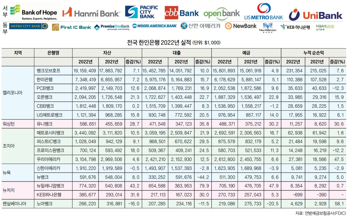 은행 16곳 중 절반인 8곳의 자산이 두 자릿수 증가율을 기록하며 성장했다. 자산 증가 폭이 가장 컸던 은행은 뉴밀레니엄뱅크(43.2%)였다. 뉴욕주의 신한아메리카와 펜실베이니아주의 노아뱅크는 자산 규모가 각각 0.5%, 16.0% 감소했다. 은행들의 2022년 총예금고도 전년 대비 7.1% 증가한 390억1655만 달러로 나타났다. 전국 한인은행들의 대출 규모는 378억9889만 달러로 2021년과 비교해 13%(43억5357만 달러) 늘었다. 대출과 예금 성장률도 동부 지역이 서부 지역 은행보다 소폭 앞섰다.