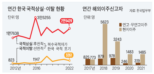 법무부 통계에 따르면 연평균 약 2만명의 선·후천적 복수국적자가 한국 국적을 포기하는 셈이다. 같은 기간 한국 국적을 취득한 사람(14만8528명)보다 1.7배나 많다. 이들의 발길은 대부분 선진국으로 향했다. 최근 5년(2018년~2022년)간 한국 국적상실·이탈자의 새 국적은 미국(56.2%), 일본(14.8%), 캐나다(13.6%) 순으로 많았다.