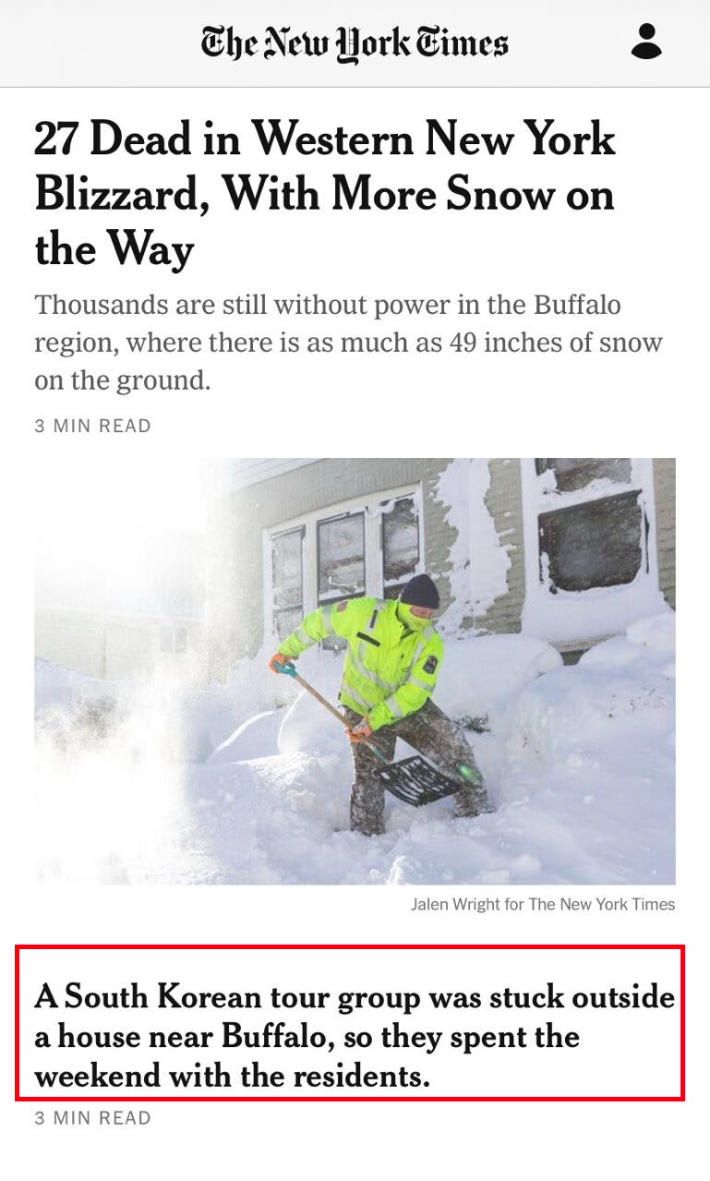 뉴욕타임스(NYT)는 이날 버팔로 교외지역에서 눈에 갇힌 한국인 9명이 친절한 미국인 부부 덕분에 특별한 성탄절을 보냈다는 소식을 홈페이지 주요 기사로 배치했다.
