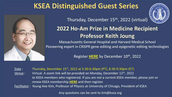이번 온라인 행사에서 정 교수는 자신의 주요 연구 분야인 크리스퍼 유전자편집과 후성유전체편집 연구개발에 대해 강의할 예정이다. 이어 한인 2세로서의 성장 과정과 과학자가 되기까지의 여정 또한 공유한다.