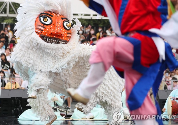 (안동=연합뉴스) 김현태 기자 = 3일 경북 안동시 운흥동 문화 플랫폼 모디684(옛 안동역) 광장에서 열린 '2022 안동국제탈춤페스티벌'에서 봉산탈춤이 행사장을 찾은 관람객들을 즐겁게 하고 있다. 안동국제탈춤페스티벌은 코로나19 확산으로 열리지 못하다 3년 만에 다시 선보였다.
