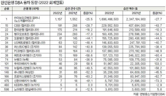 연방중소기업청(SBA)이 최근 발표한 ‘2021~2022회계연도’ 연간 실적(승인액 기준) 발표에 따르면 전국 한인은행 16곳이 승인받은 SBA융자 규모는 약 15억7300만 달러였다. 이는 전년의 26억8400만 달러와 비교하면 11억1100만 달러(41%) 이상 부족한 것이다. 건수도 작년보다 671건(36%)나 줄었다. 〈표 참조〉 다만, 팬데믹 이전인 2019 회계연도의 16억 달러와 비교하면 소폭 준 것이다.