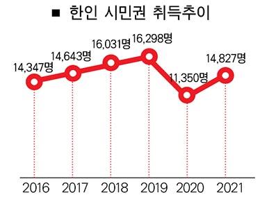 한인들의 시민권 취득 추이를 연도별로 보면 지난 2008년 2만2,759명으로 사상 최대를 기록한 후 2010년 1만1,170명까지 떨어졌다가 2012년 1만3,790명, 2014년 1만3,587명, 2016년 1만4,347명으로 증감을 반복했다. 이어 2018년 1만6,031명, 2019년 1만6,298명까지 큰 폭으로 증가했지만 코로나19 사태를 맞으면서 급감한 바 있다.