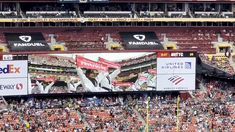 미 NFL 초청으로 이뤄진 이날 행사에서 흰색 도복과 검은 띠를 착용한 시범단이 미식축구장에서 고난도의 격파 기술 등을 선보인 뒤, 열을 지어 품새 시범을 보이자 관중들이 기립박수로 화답했다.