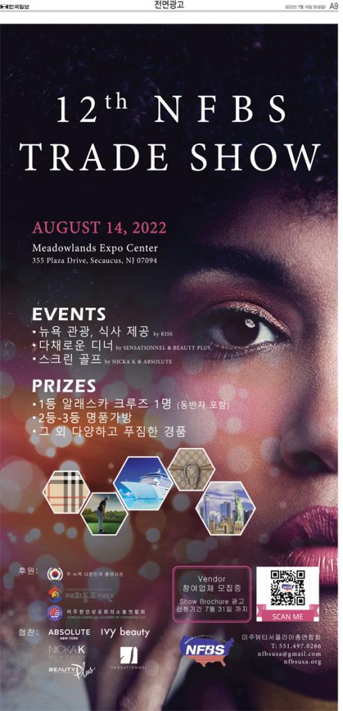 7,000여 미주 한인 뷰티서플라이 종사자들이 한 자리에 모이는 대규모 뷰티서플라이 박람회가 열린다. 미주뷰티서플라이총연합회(NFBS)는 ‘2022 뷰티 트레이드쇼’를 오는 14일 뉴저지 메도우랜즈 엑스포 센터에서 개최한고 11일 밝혔다. 뷰티 트레이드쇼가 재개되는 것은 코로나19 팬데믹 사태 등으로 인해 중단된 지 4년 만이다.