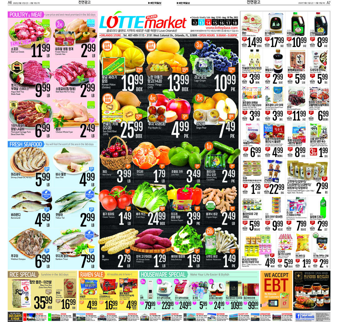 쌀, 라면 스페셜로 밥맛좋은 이천쌀(40LB) 35.99, 쓰루마이 현미(15LB) 16.99, 팔도 비빔면(5PC) 4.99, 농심 신라면(박스) 16.99, 삼양 불닭 볶음면(라이트/오리지날/핵) 4.99에 판매한다.